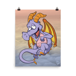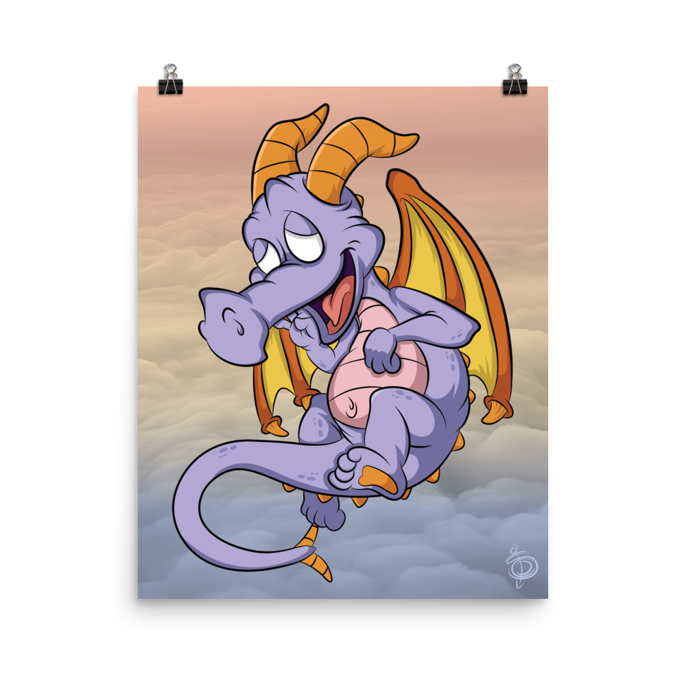 This design reimagines the beloved Disney dragon, Figment, through the bold strokes of street art and the playful exaggeration of new school tattoos. With wide-eyed wonder and a grin full of mischief, Figment floats against a soft, cotton-candy cloudscape a backdrop as whimsical as imagination itself.