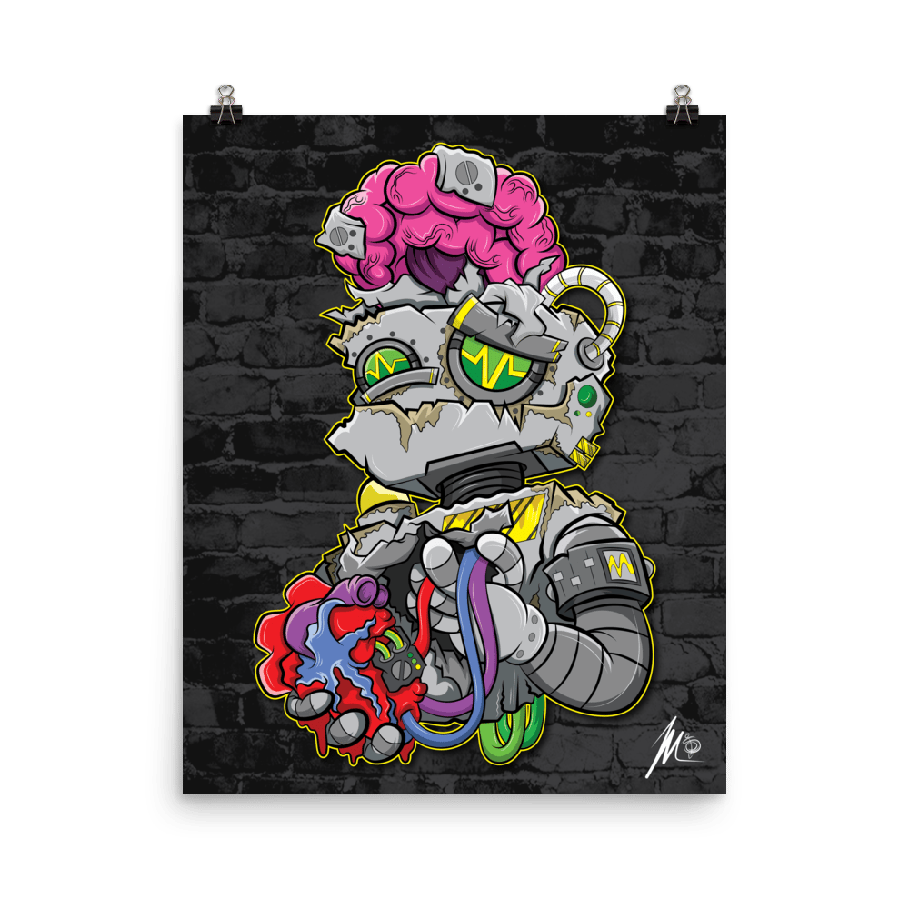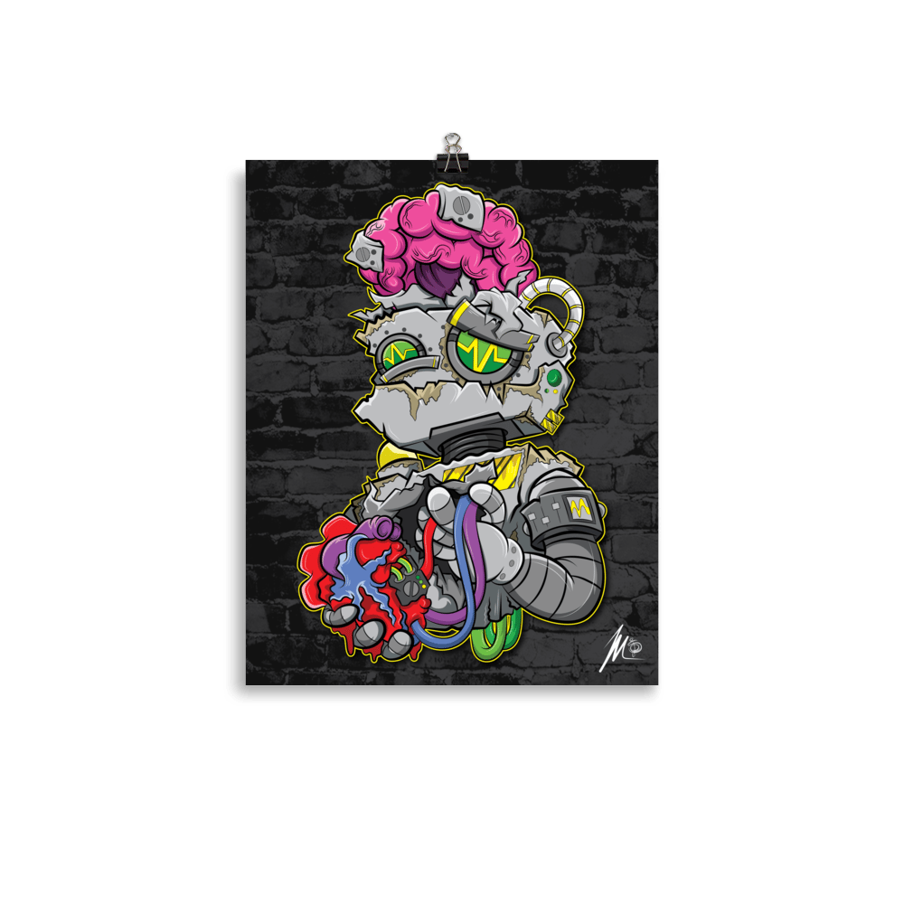 A lone robot stands, brain exposed, holding out its fragile heart a paradox of strength and vulnerability. This design weaves street art grit with new school surrealism to tell a story of what it means to feel too much in a world that gives too little back.